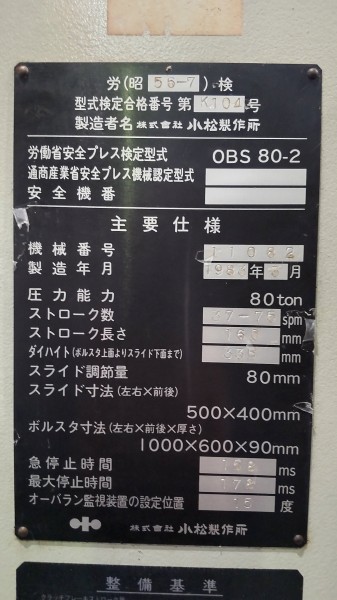 コマツ OBS80-2 / KOMATSU Power Press OBS80-2(SM063)